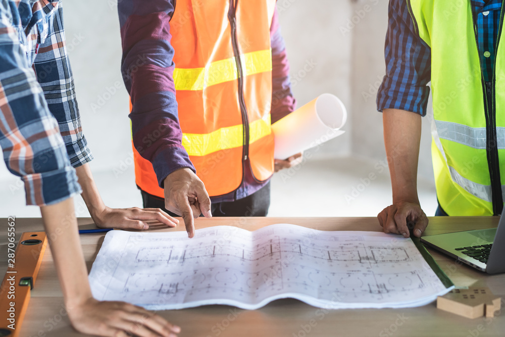 Photos Group of architect look at blueprint and planning to renovation room