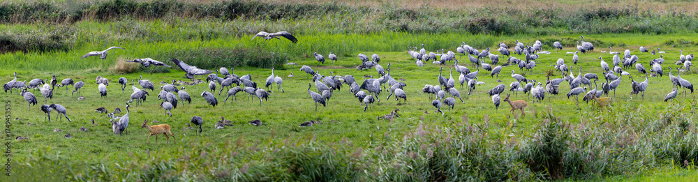Photos Group of Common Cranes (Grus grus) including juvenile birds resting together wit