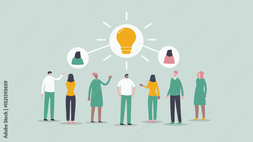 Photos Group of people standing with lightbulb and person icons above them suggesting c