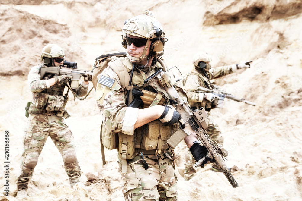 Group of well equipped US army commandos armed with assault rifles, moving through sandy terrain or desert. Military reconnaissance team secret operation, special forces mission on enemy territory