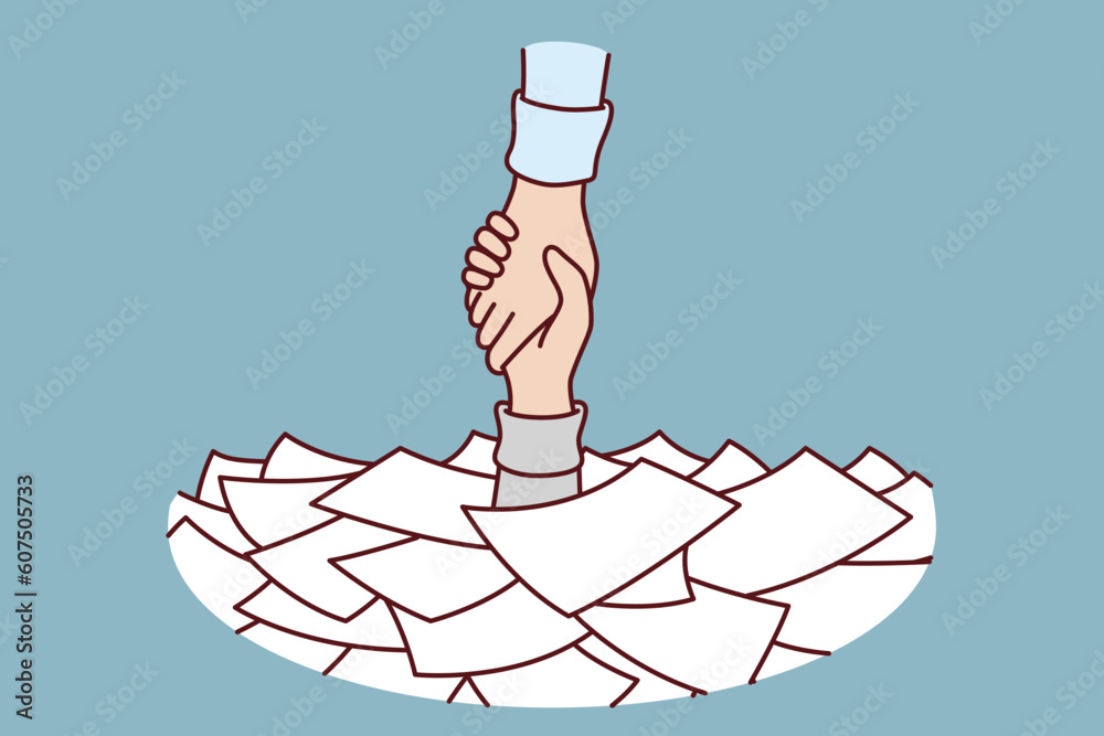 Photos Hand among papers and documents asks for help and salvation from bureaucracy and overabundance paperwork that causes burnout