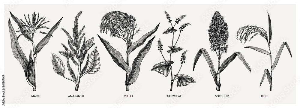 Photos Hand drawn cereal crops - maize, millet, sorghum, rice, buckwheat, amaranth sketches