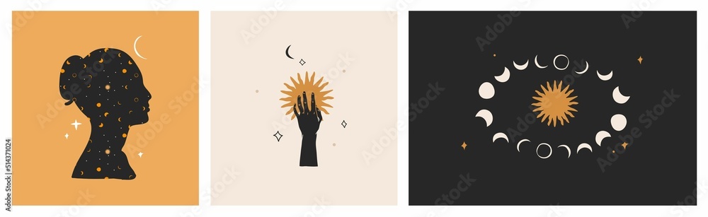 Tableau sur toile Hand drawn vector abstract stock flat graphic illustrations set with logo element,bohemian astrology magic art of galaxy space,crescent moon,stars,sun and human silhouette,simple style for branding