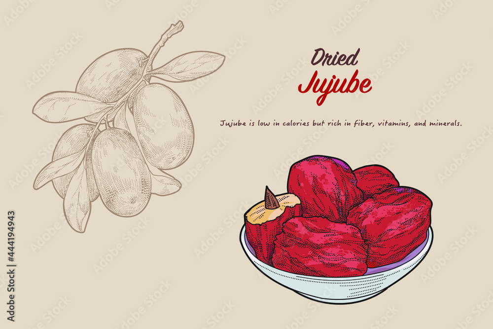 Photos Hand-drawn vector illustration of healthy fruits jujube by retro style, drawing by engraved dot and line