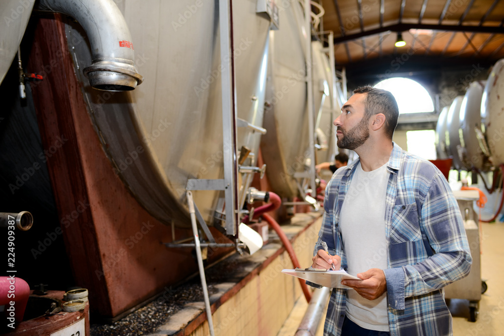 Tableau sur toile handsome man winemaker in a winery wine cellar during harvest season with stainl