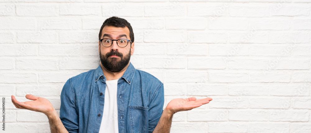 Photos Handsome man with beard over white brick wall having doubts while raising hands