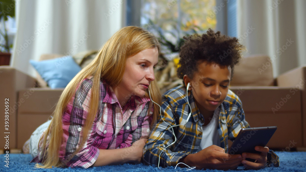 Photos Happy foster mother and son lying on floor and using tablet pc and headphones at