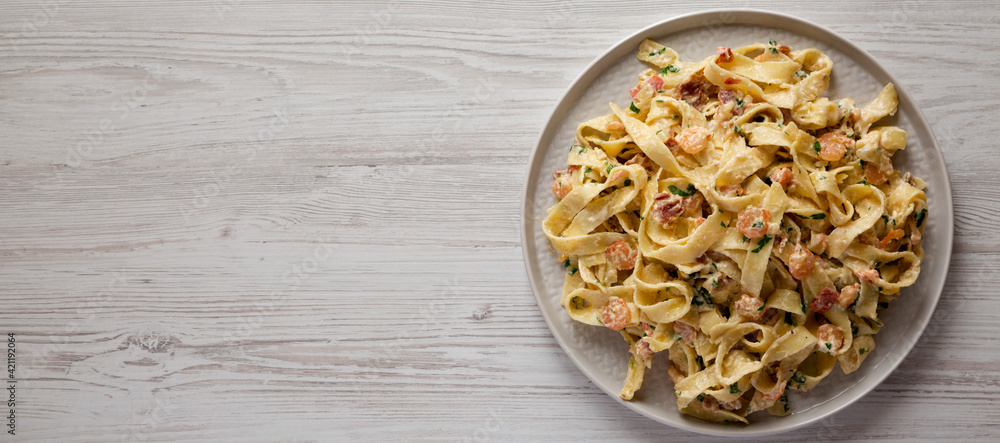 Photos Homemade Garlic Shrimp Bacon Alfredo on a plate on a white wooden background, top view
