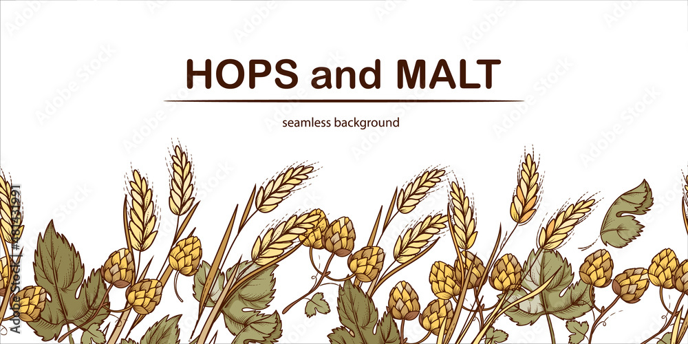 Photos Hops and malt seamless background or repeatable frame lower part for beer brewing and packaging, hand drawn style vector illustration isolated on white background
