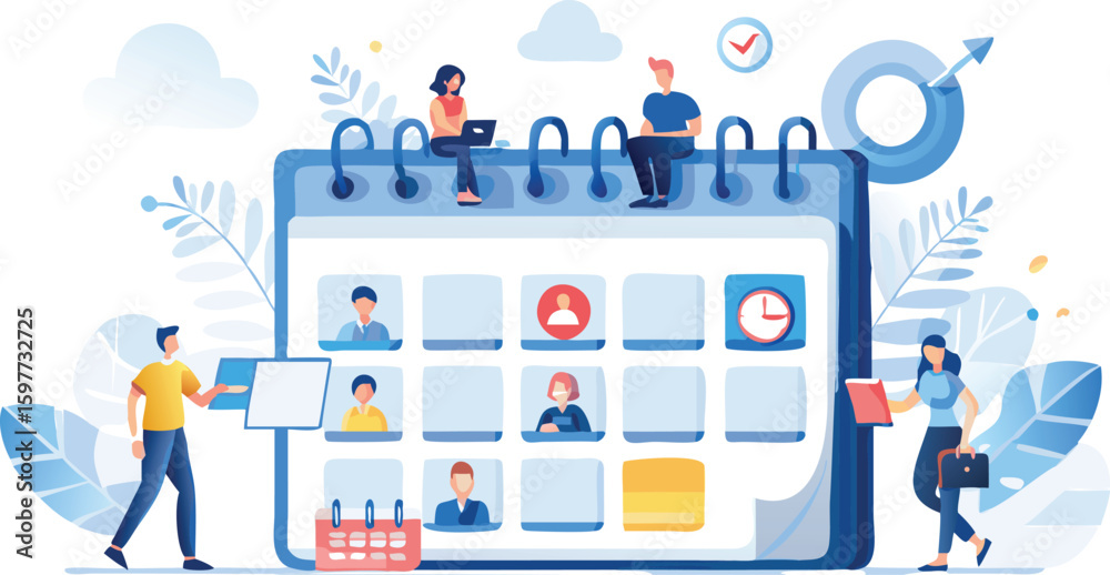 Photos Illustration of a large calendar with people interacting with it and scheduling
