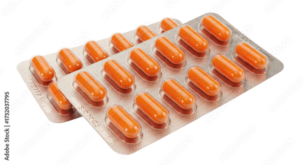 Photos Isolated blisters with capsules of medicine in a package, orange color, in front