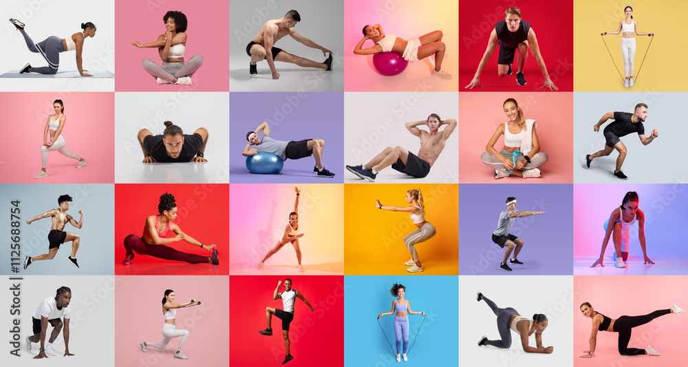 Photos Individuals perform different workouts including stretching, strength training, and cardio exercises in a colorful indoor setting