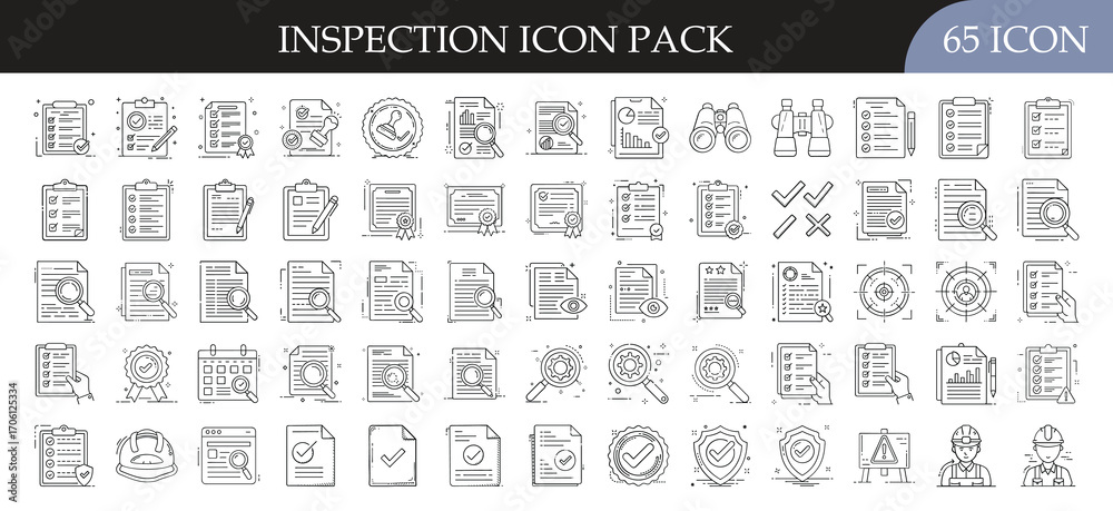 Tableau sur toile Inspection and Quality Control Icon Set - Collection of 65 outline icons featuring checklists, magnifying glasses, documents, reports, and audit tools for inspection, review, and verification themes