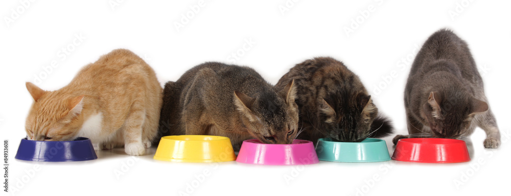 Tableau sur toile Kätzchen fressen aus Näpfen isoliert