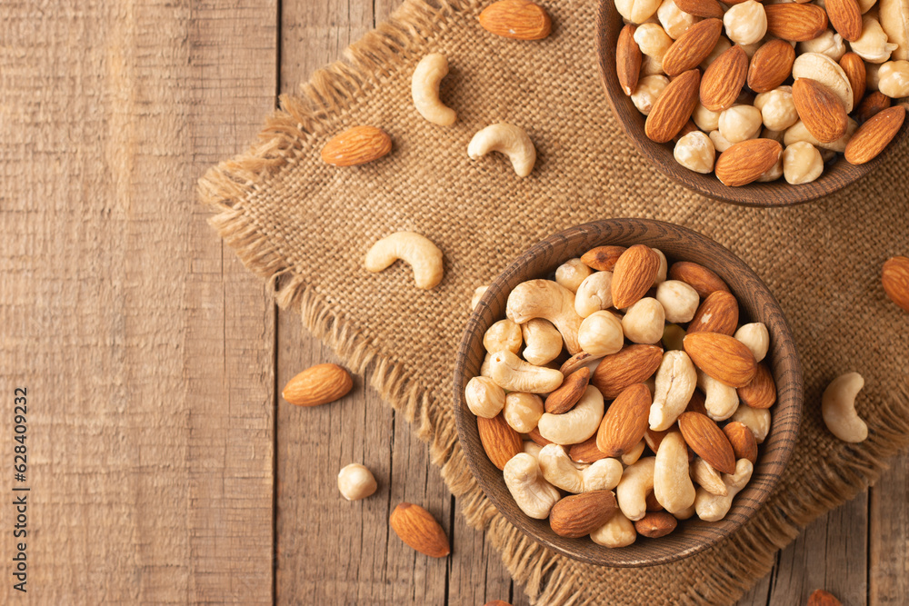 Photos Large assortment of nuts in different bowls on stone table.