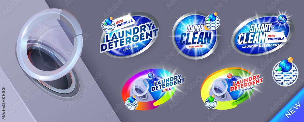 Large set Laundry detergent banners for smart clean. Template for laundry detergent. Package design for Washing Powder & Liquid Detergents ads. Isolated vector illustration