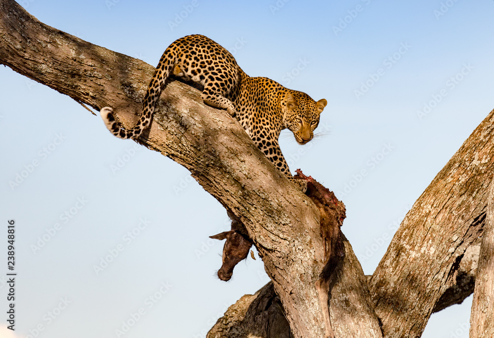 Tableau sur toile leopard in a tree with dead prey he has taken up a tree