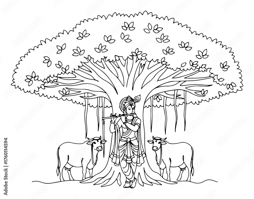 Tableau sur toile Lord Krishna playing flute under a Banyan tree with cows