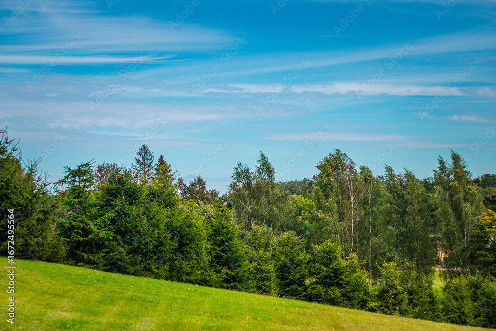 Photos Lush green hillside with dense conifer and birch trees under a bright blue sky with soft clouds on a sunny day