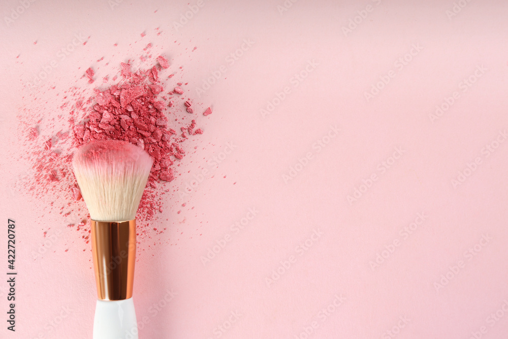 Makeup brush and scattered blush on pink background, top view. Space for text