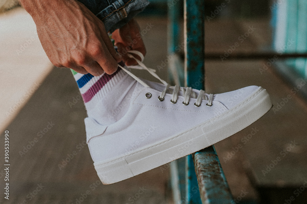 Photos Man fixing shoelaces on white sneaker