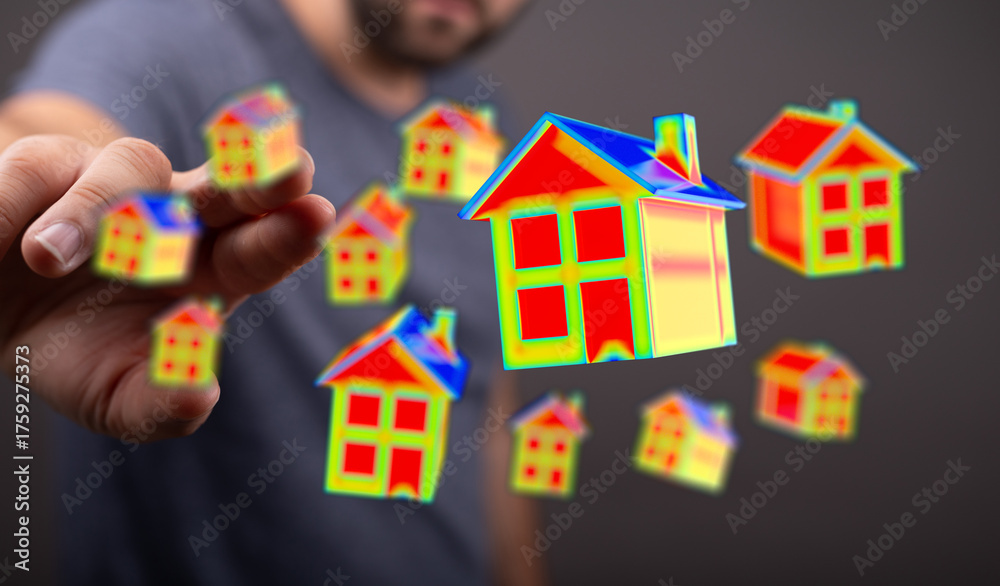 Photos Man's hand with floating houses representing concepts like property investment, real estate, homeownership, and dreams