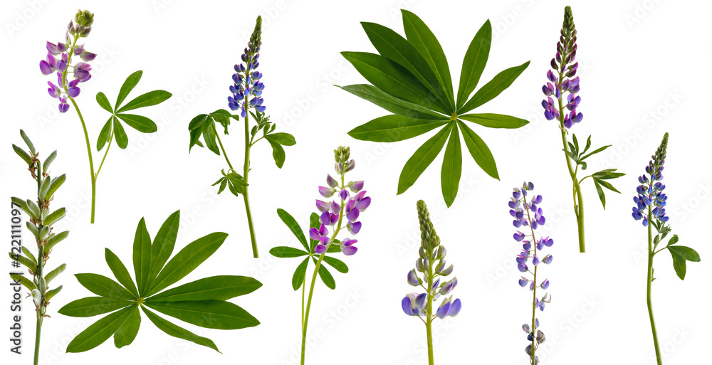 Tableau sur toile Many stems of lupine flowers and leaves and pods on white background