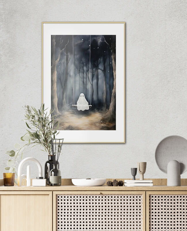 Poster Ghost on Swing, Ghost Painting, October Painting, Cute Ghost