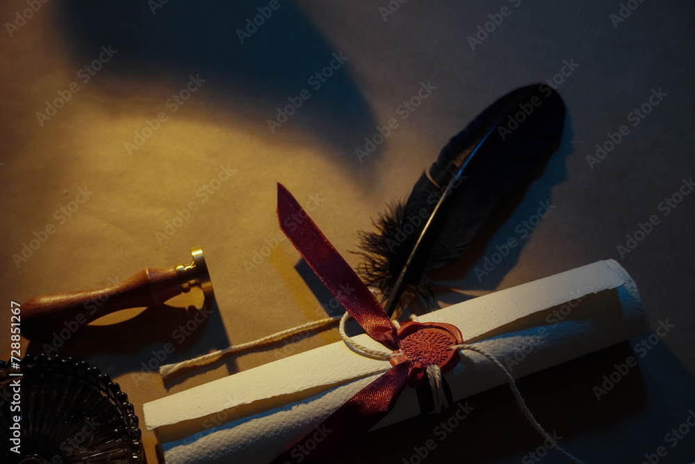 Tableau sur toile Medieval scroll letter tied with red ribbons and sealed with wax stamp next to t