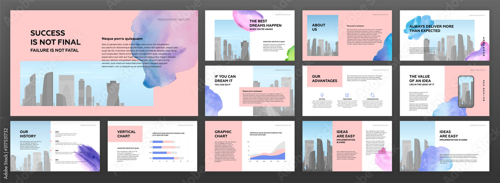 Photos Modern powerpoint presentation templates set for business with colourful watercolour blots and cityscape illustration on background