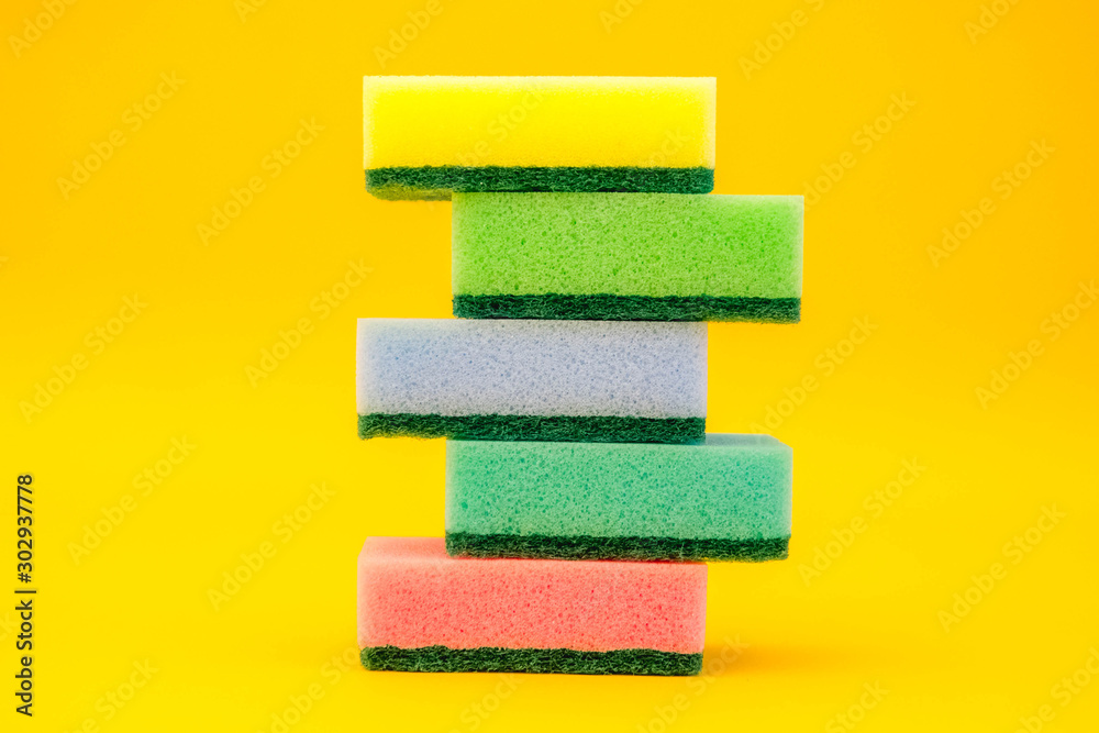 Photos Multicolored sponges for cleaning folded pyramid on a yellow background