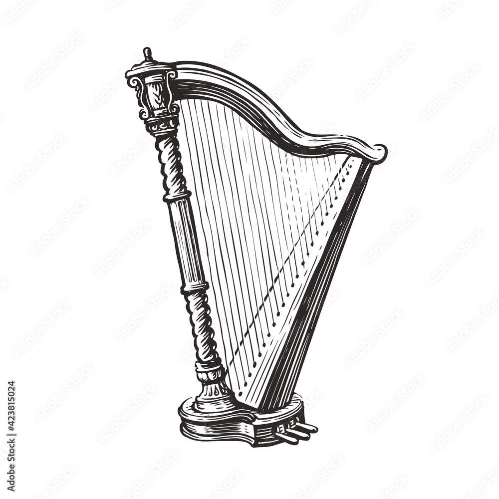 Tableau sur toile Musical harp hand drawn sketch. Music concept vector illustration