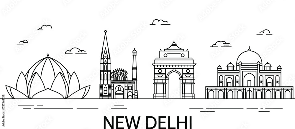 Photos New Delhi skyline line art featuring iconic landmarks like Lotus Temple, India Gate, and Jama Masjid for travel, tourism, and design projects