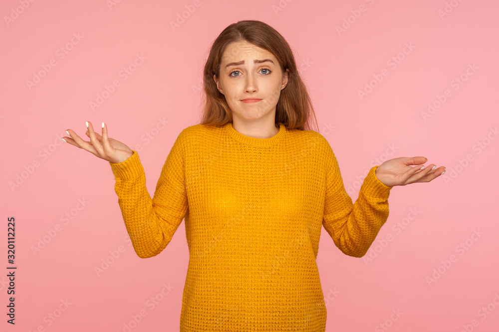 Tableau sur toile No idea, I don't know! Portrait of uncertain confused ginger girl in sweater expressing doubts and bewilderment, looking at camera with question so what, who cares