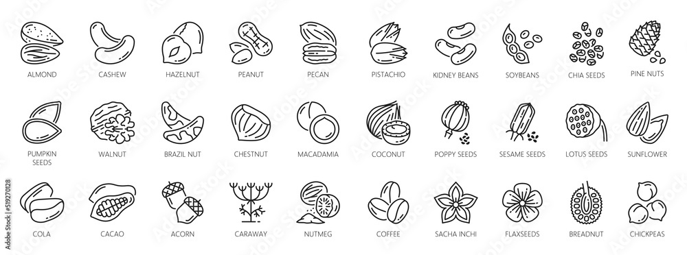 Tableau sur toile Nuts outline icons of peanut, walnut and almond, vector seeds and beans, cacao a