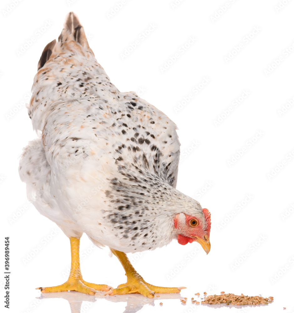 Tableau sur toile one white chicken pecking grains, isolated on white background, studio shoot
