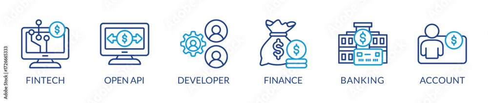 Photos open banking vector illustration banner with icons, symbols and keywords