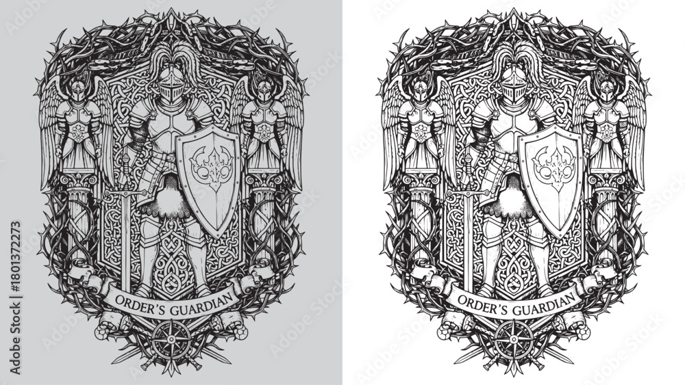 Tableau sur toile Order's Guardian: Medieval Knight in Armor Shield with Thorny Vines