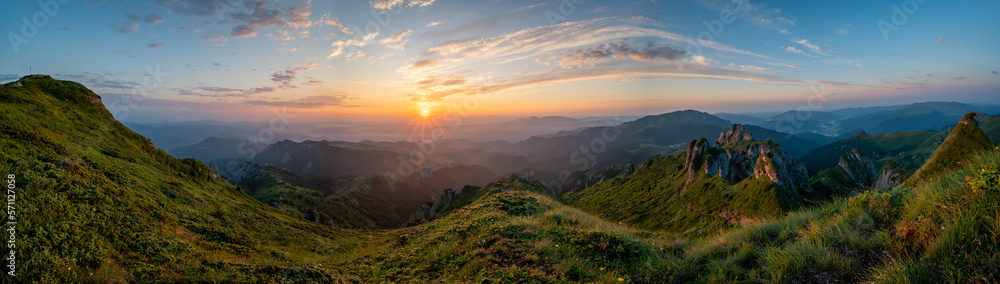 Photos Panorama of green meadow with rocks and rocky mountains in romanian mountains in