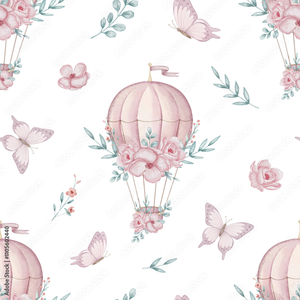 Papier peint Seamless watercolor Pattern with pink hot air balloon, flowers and butterflies