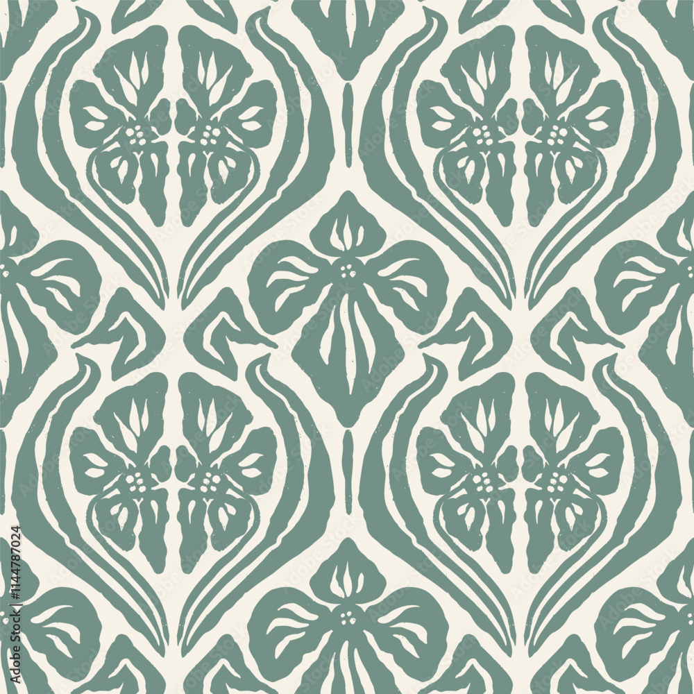 Papier peint Monochrome green brush strokes inky flowers seamless pattern damask style