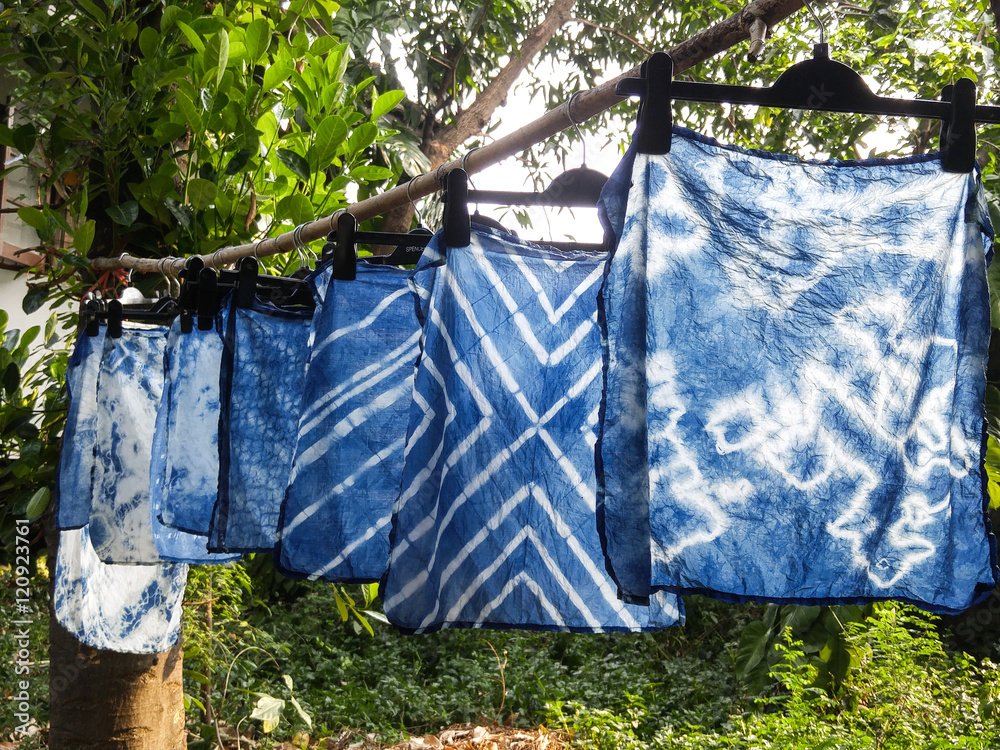 Papier peint Beautiful natural indigo tie dye fabric with garden view in background