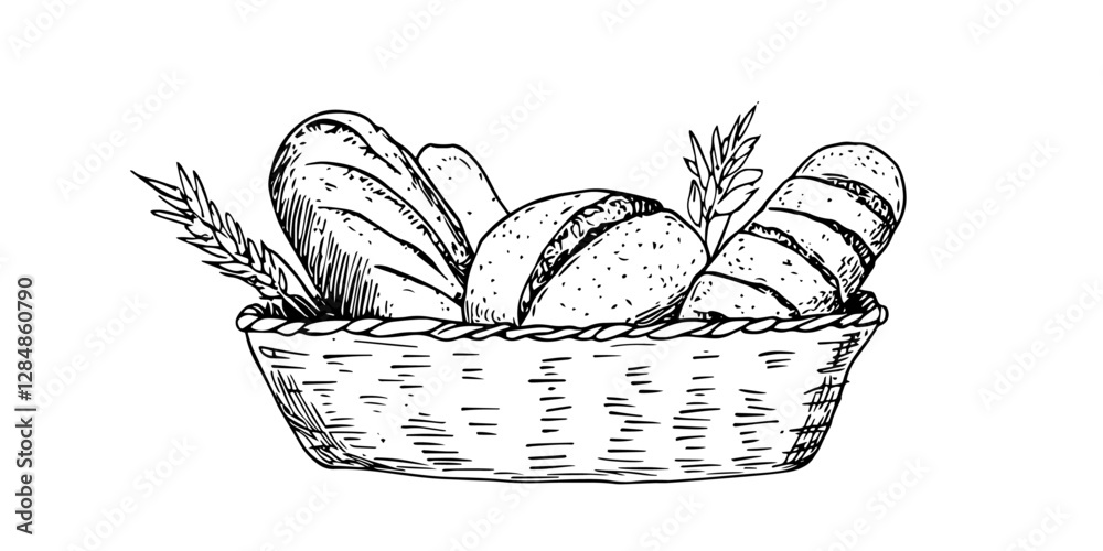 Papier peint basket of assorted bread loaves vintage engraving style doodle sketch vector
