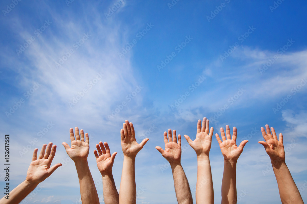 Papier peint volunteering concept, hands of group of people volunteers in blue sky