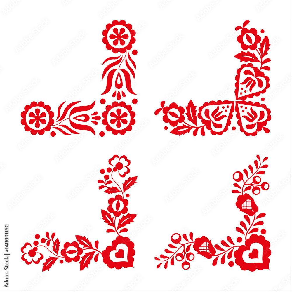 Papier peint Set of four traditional folk ornaments, red embroidery isolated on a white backg