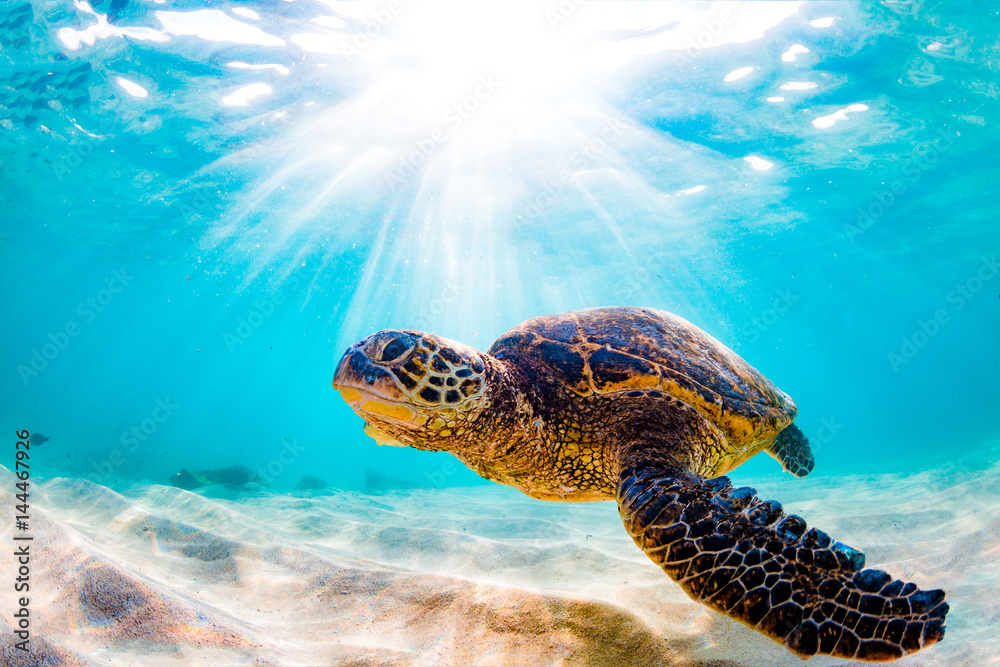 Papier peint Endangered Hawaiian Green Sea Turtle Cruising in the warm waters of the Pacific