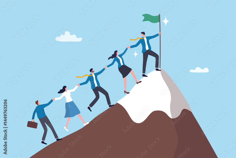 Papier peint Team achievement, teamwork to success together, colleagues support or leadership to lead team to overcome challenge, cooperation concept, business people team member help others reach mountain peak