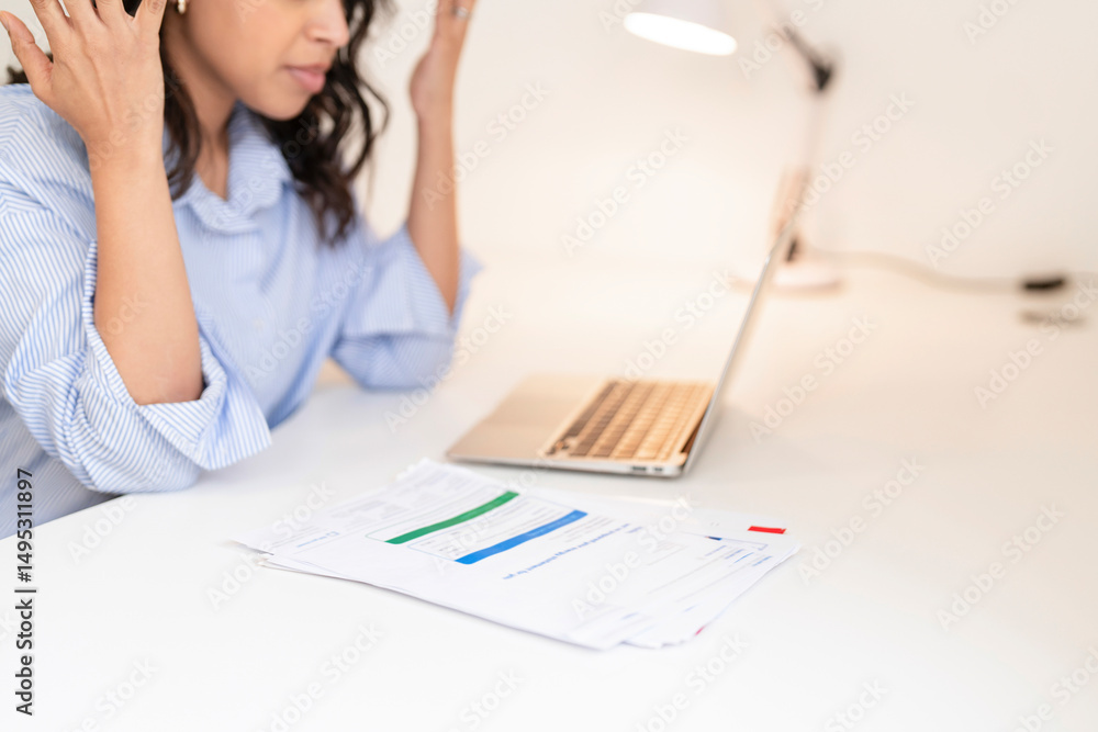 Papier peint Young woman feels stressed while working on a laptop at home with documents scat