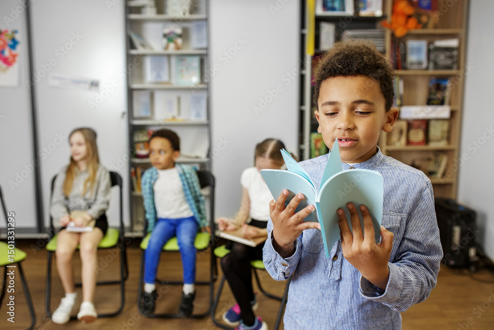 Papier peint Young boy reads a book aloud during classroom activity in cozy learning environment