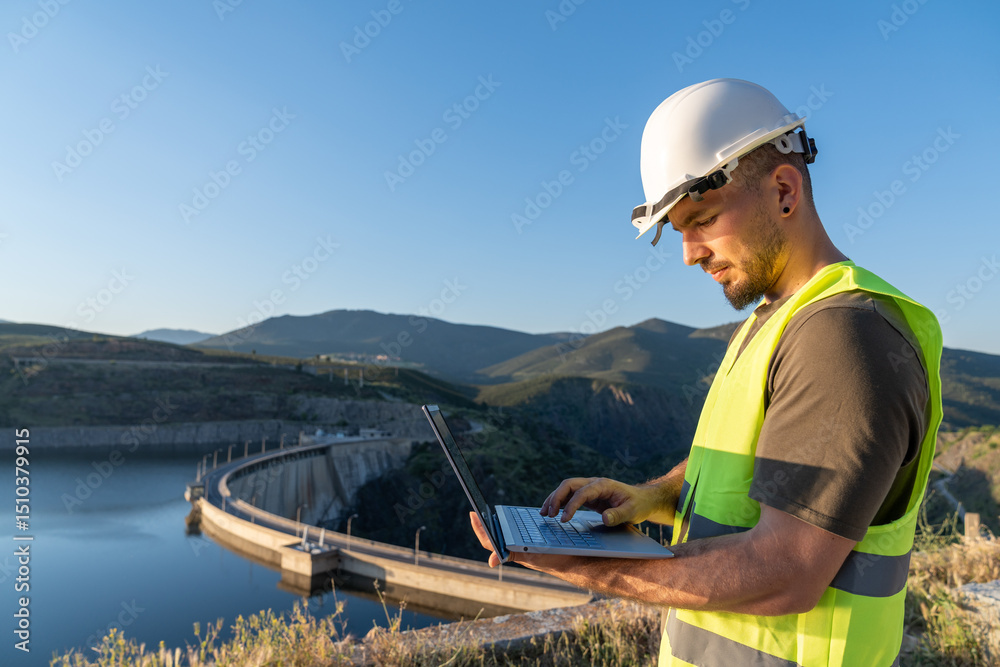 Papier peint Engineer working with laptop at hydroelectric power plant dam